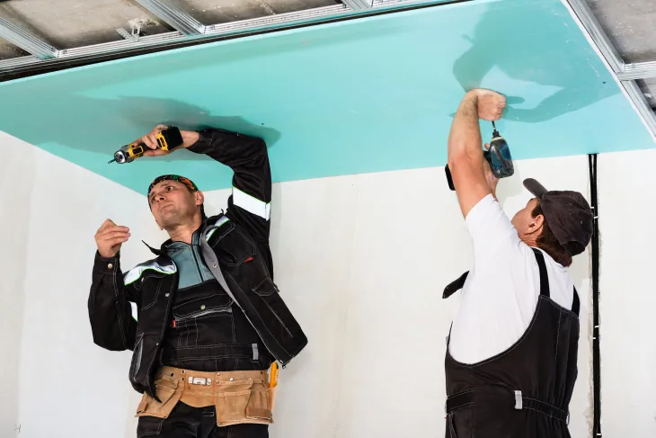 Pose précise de panneaux préfabriqués associant isolant performant et plaque de plâtre pour une finition impeccable qui valorise votre intérieur tout en améliorant son rendement énergétique.
